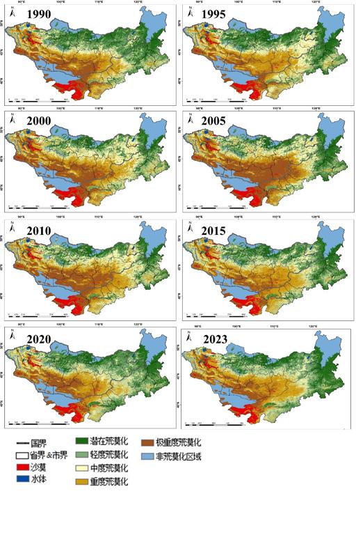 The Mongolian Plateau, representing one of the most significant arid regions in the contemporary Northern Hemisphere, is a typical area highly sensitive and vulnerable to global change while simultaneously playing a crucial role in establishing ecological security buffers for northern China and the broader expanse of northern Asia, where desertification stands as one of the most severe ecological and environmental challenges, with Mongolia itself being a global hotspot for this process. Under the combined pressures of climate change and unsustainable anthropogenic activities—including overgrazing and unregulated mining—grassland degradation and land desertification within the plateau have intensified markedly in recent decades, a trend underscored by the escalating frequency and severity of transboundary sand and dust storms (SDS) affecting both Mongolia and China, which have once again brought the desertification crisis into sharp focus. Therefore, this study utilized the Google Earth Engine (GEE) platform as the primary tool for processing remote sensing data, leveraging multi-source Earth Big Data and employing a feature-based framework coupled with machine learning techniques to conduct a refined desertification analysis, enabling the acquisition of detailed, spatially explicit desertification grade distribution maps for the Mongolian Plateau spanning 1990 to 2023 with a spatial resolution of 30 meters and a temporal interval of 5 years. This research holds substantial scientific significance and practical implications for combating desertification, enhancing ecological security, fostering cross-border cooperation, and supporting the green and sustainable socio-economic development of the Mongolian Plateau region.