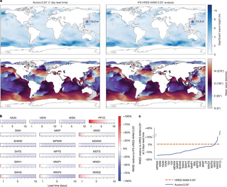 Aurora is built on a 1.3 billion parameter foundation model, trained on more than one million hours of Earth system data. It has been fine-tuned to excel in a range of forecasting tasks: Air quality: Outperforms traditional models in 74% of cases; Ocean waves: Exceeds numerical simulations on 86% of targets; Tropical cyclones: Beats seven operational forecasting centres in 100% of tests; High-resolution weather: Surpasses leading models in 92% of scenarios, especially during extreme events
